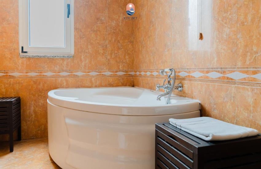🛁 Bagno privato con doccia e vasca idromassaggio moderna e set di cortesia, dotato di asciugamani soffici, asciugacapelli e prodotti naturali per la cura del corpo.