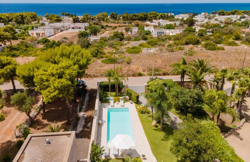 Situata a Torre Suda, la villa è incorniciata da un lussureggiante e curatissimo giardino con prato inglese, palme e piante fiorite e gode della vista mozzafiato del mare all'orizzonte.